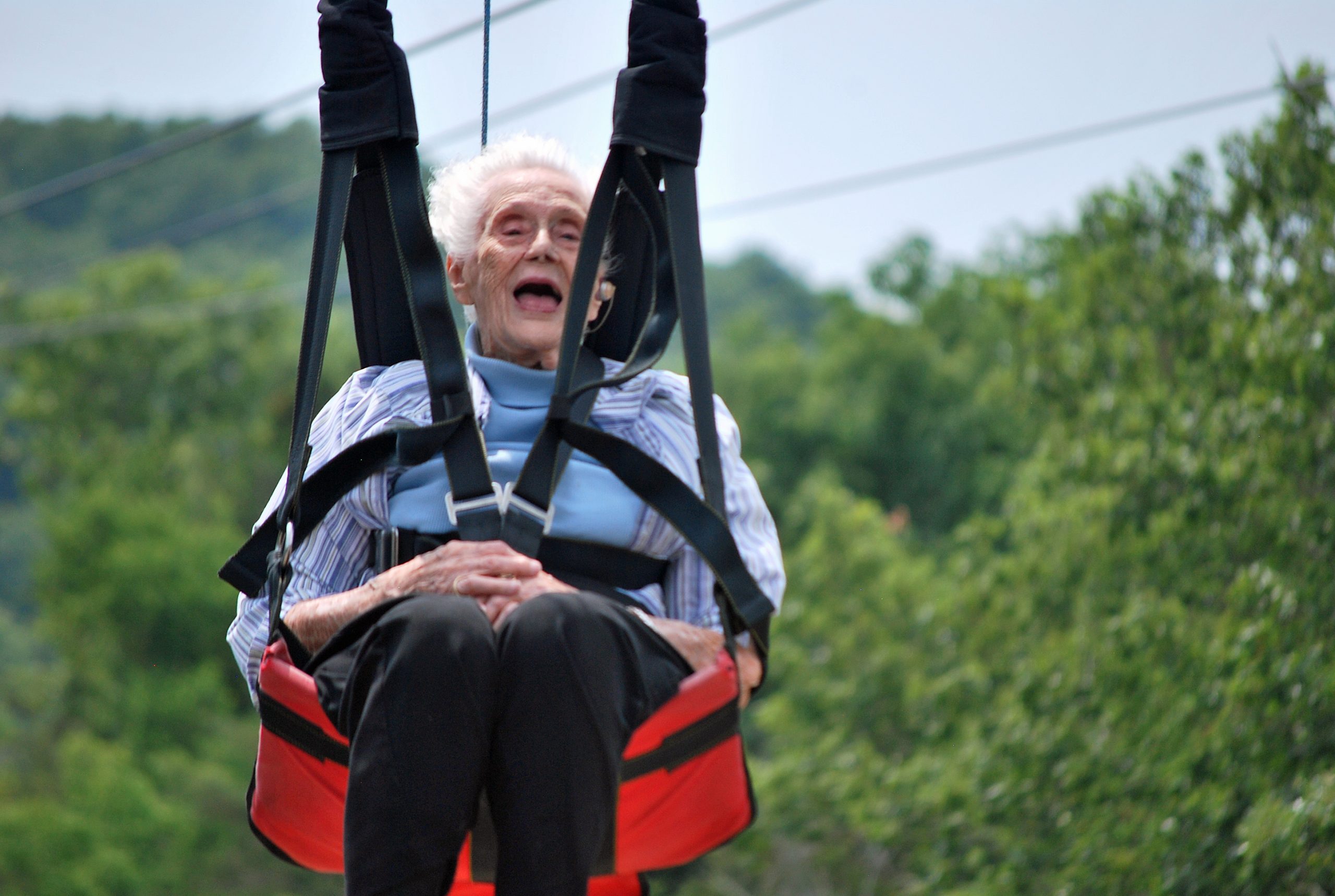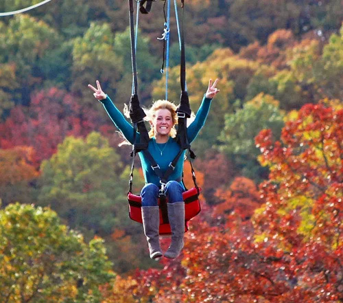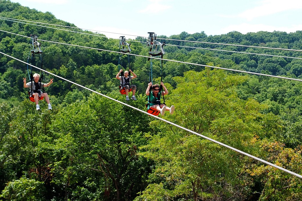 From there, riders descend to the open-air launch deck, where four side-by-side cables allow friends and family to take off together. When the gates open, gravity takes over instantly—no harness fitting, no complicated setup, just a smooth seated launch from 140 feet in the air. The flight covers 2,370 feet (over half a mile) with a 370-foot vertical drop, reaching speeds of up to 50–55 mph as you glide over the treetops, trails, and historic structures of the homestead below. It’s a rare combination of speed, height, and scenery—action sightseeing at its best. After landing at the base of the hill, guests are transported back to the tower, completing an experience that blends adventure with the deep cultural heritage of the Ozarks.