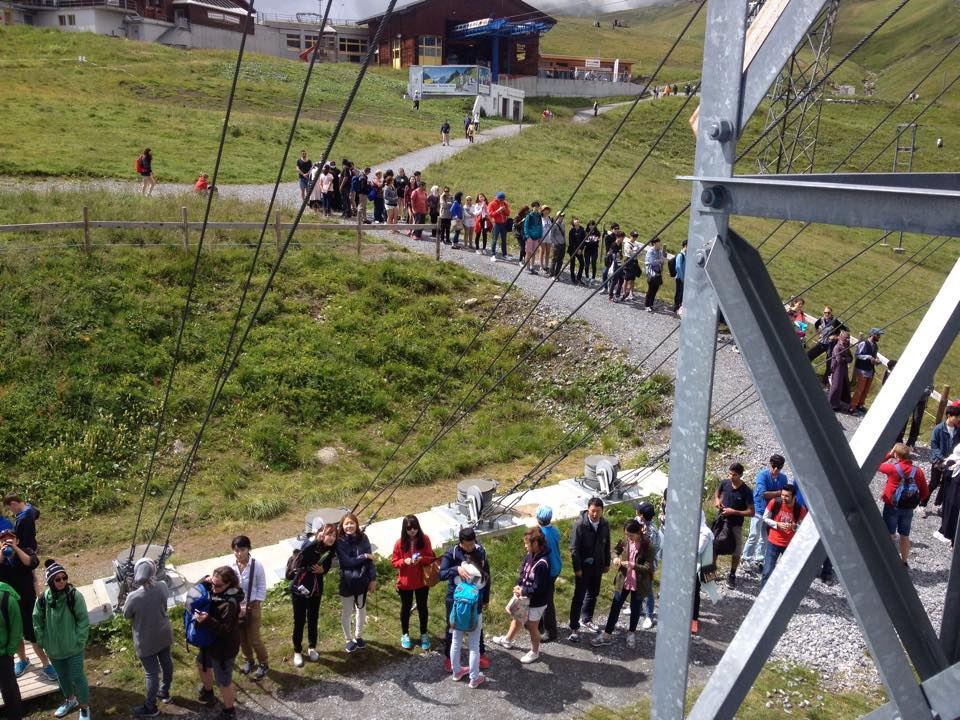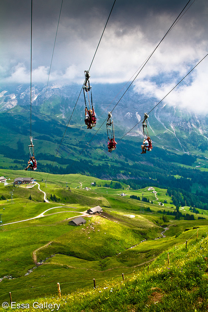 Your adventure begins with a scenic gondola ride on the Grindelwald Firstbahn, a multi‑stage lift that climbs through meadows, forests, and dramatic alpine terrain. From the First summit, riders walk a short distance to the launch platform, where four parallel cables stretch 800 meters (2,625 feet) down to the Schreckfeld station. From here, the views of the Eiger and surrounding peaks are nothing short of spectacular.
