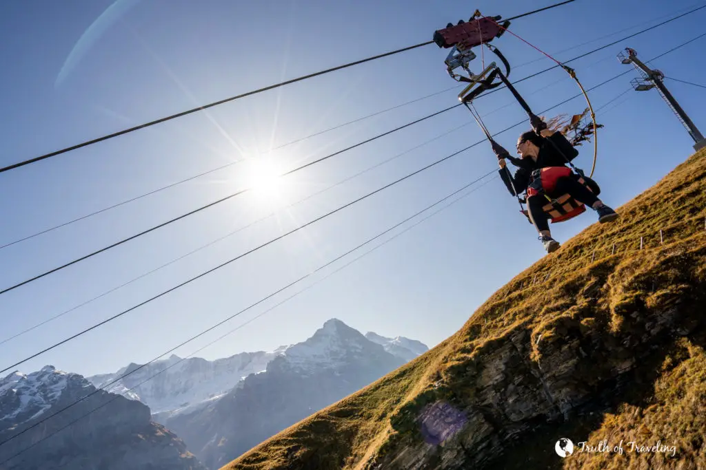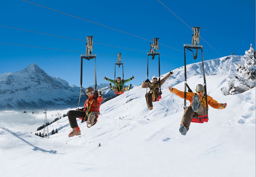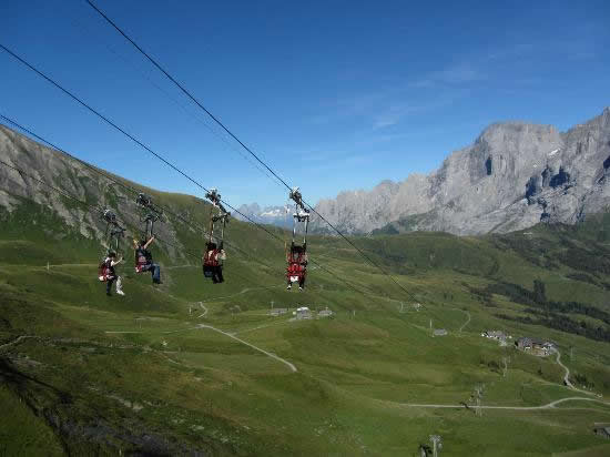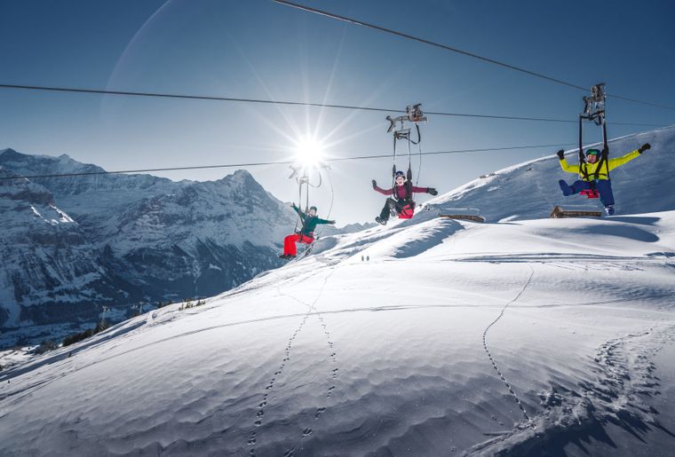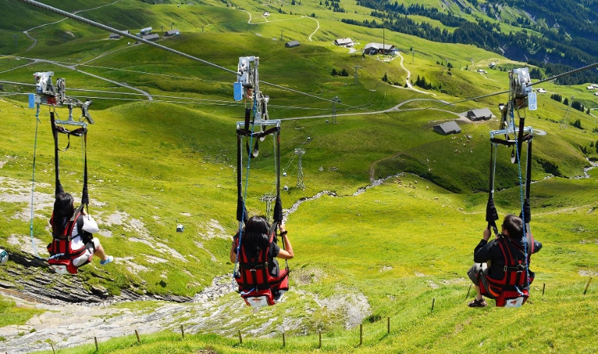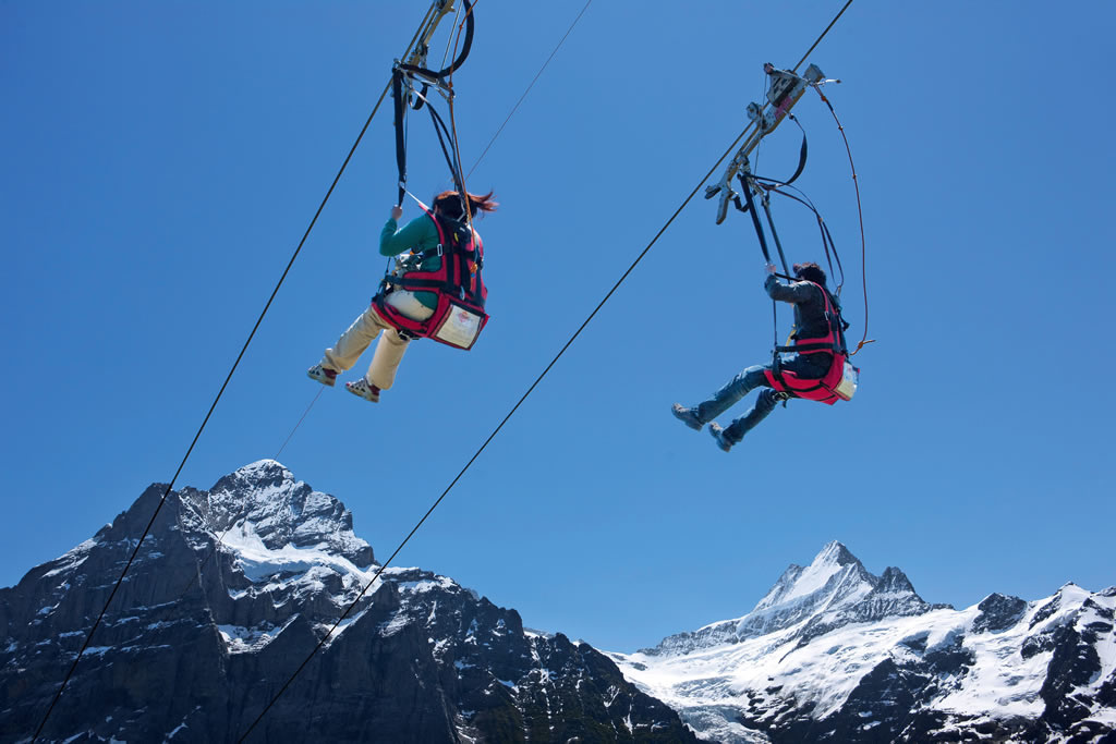 The First Flieger received TÜV certification in 2008 and continues to operate with the highest Swiss and European safety standards. With four side‑by‑side lines, families and friends can ride together, making it one of the most popular adventure activities in the Jungfrau region.