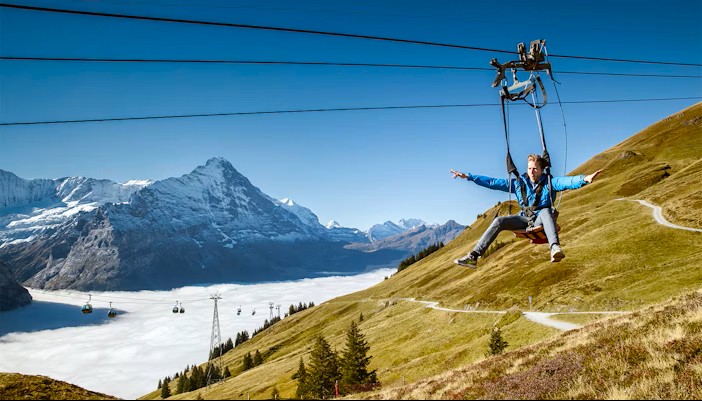 Located above the village of Grindelwald in the Jungfrau region, the First Flieger sits in one of Switzerland’s most photographed landscapes—surrounded by the Eiger, Wetterhorn, and the sweeping Grindelwald valley. Millions visit the area each year for the Jungfraujoch “Top of Europe,” and the First Flieger adds a powerful dose of adrenaline to this world‑class alpine destination.