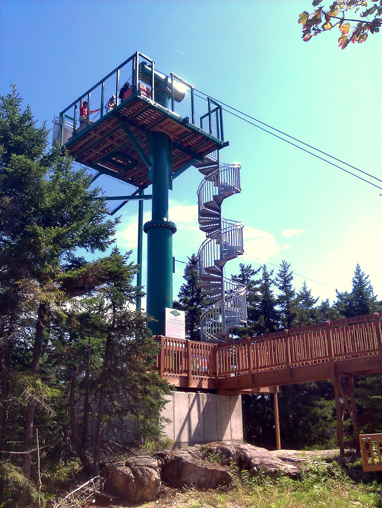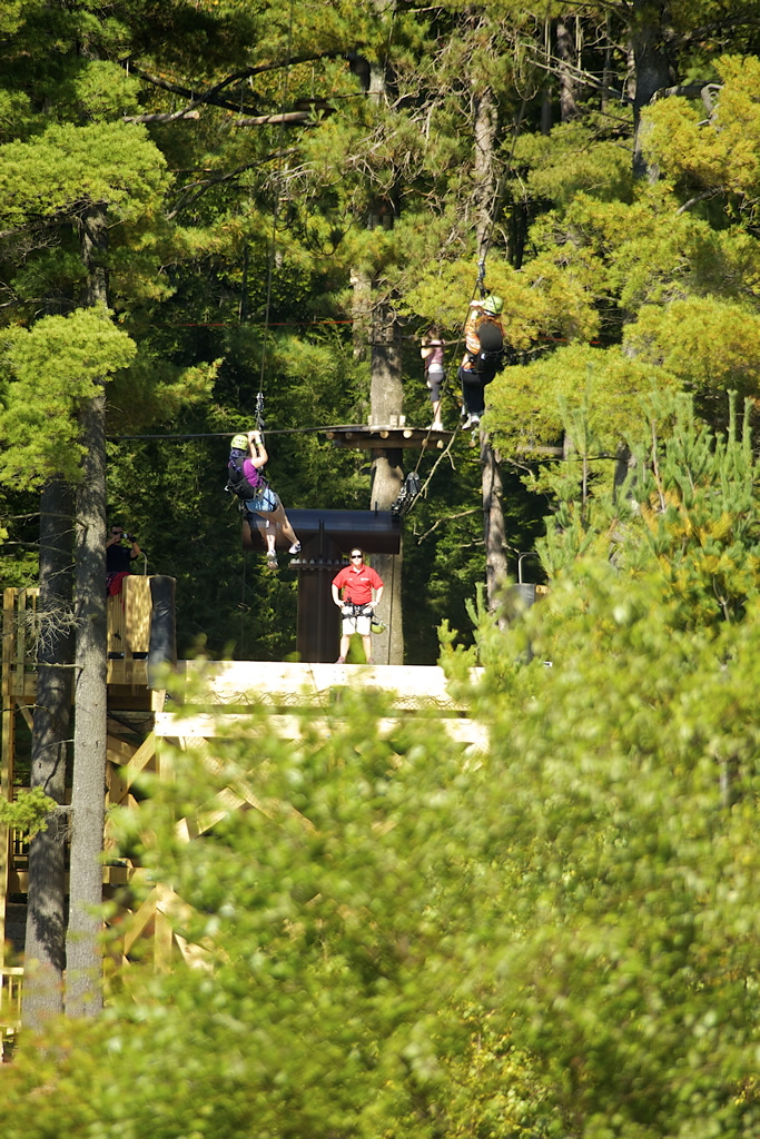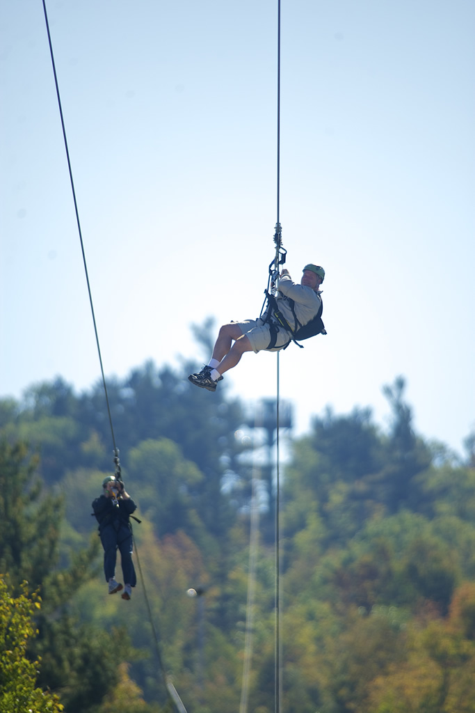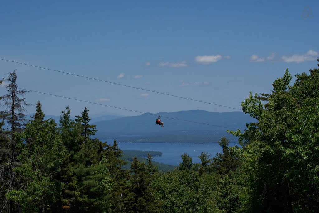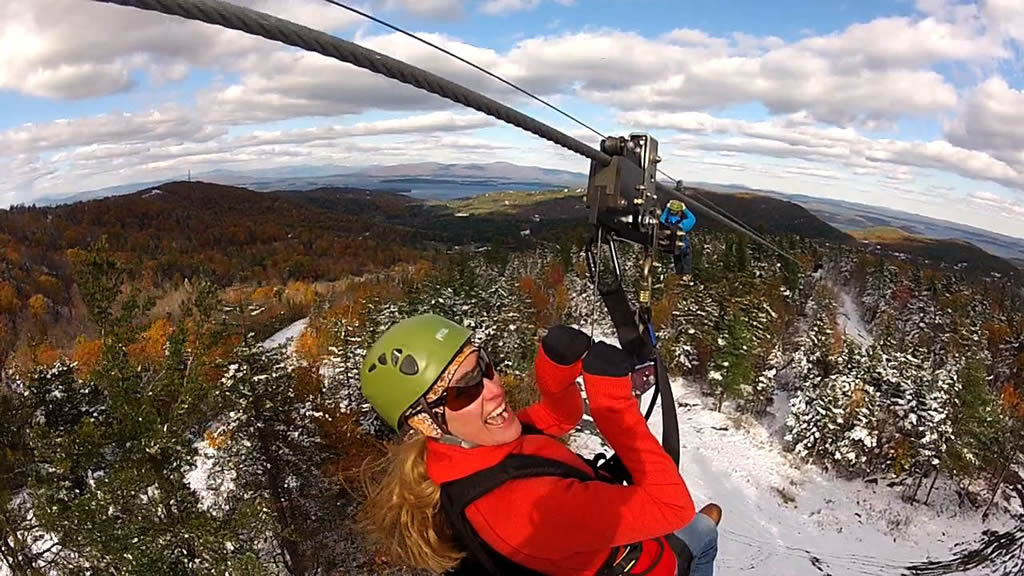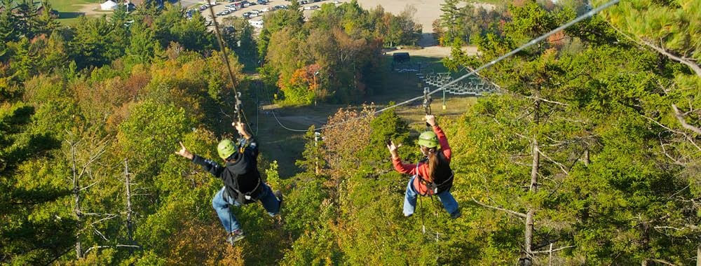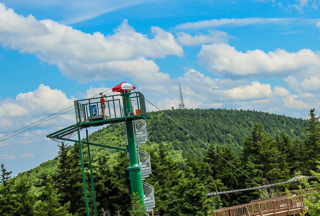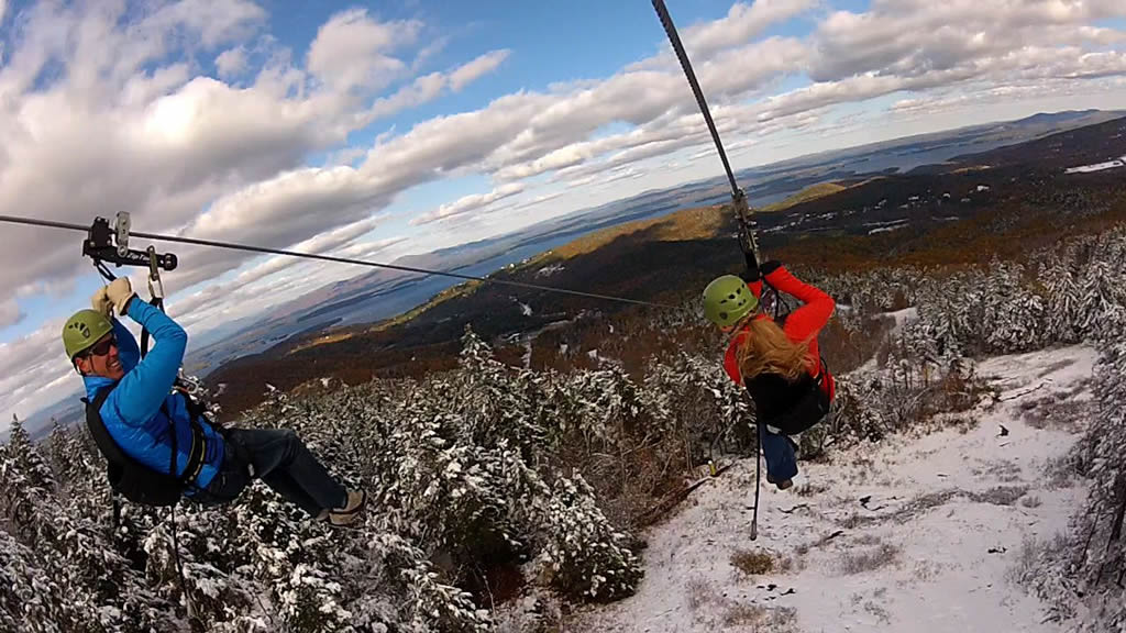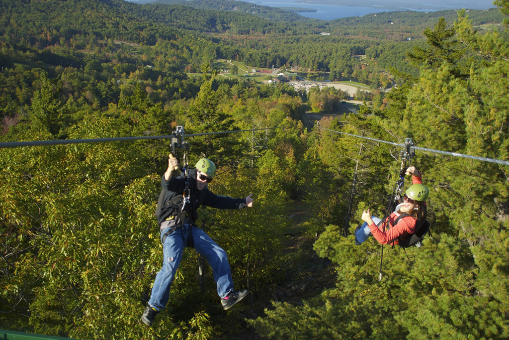 Next comes the ascent to the summit aboard the Panorama High‑Speed Quad, where sweeping views of Lake Winnipesaukee and the surrounding mountains heighten the anticipation. At the top, riders launch onto the Panorama Zip, a fast, exhilarating first span that introduces the scale of the full tour. The journey continues on the Recoil Zip, accessed by climbing a 40‑foot tower to one of the most scenic launch points in New Hampshire. As you step off the platform, the landscape becomes a blur of treetops, ridgelines, and open sky—an unforgettable flight over terrain that few people ever get to explore.