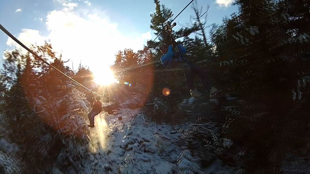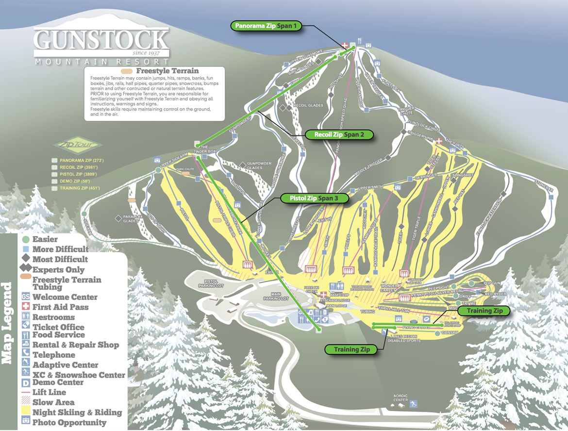 The grand finale unfolds on the Pistol Zip, a long, smooth descent over Gunstock’s ski trails and across the snowmaking pond, where riders often catch their reflection as they glide toward the base area. With side‑by‑side cables on every span and full rider-control throughout the tour, sharing the experience with friends and family makes the Gunstock ZipTour® a standout mountain adventure.