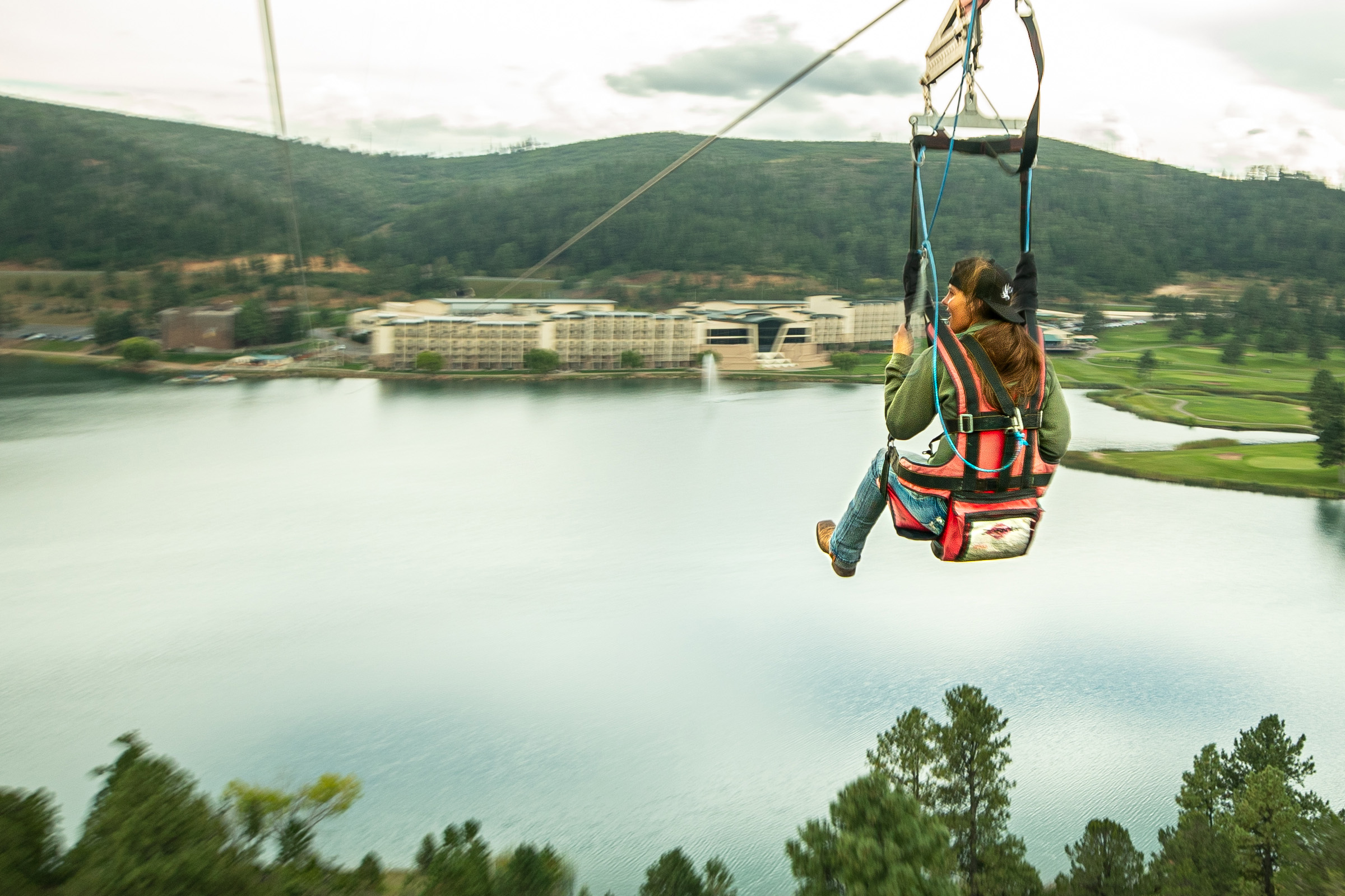 The Apache Eagle ZipRider® has been a signature attraction at Inn of the Mountain Gods since 2014, drawing guests year‑round to experience one of the most scenic and memorable rides in New Mexico. Launching from the forested mountain across Lake Mescalero, riders soar 2,668 feet toward the resort, gliding high above the water with panoramic views of the surrounding peaks and the sacred lands of the Mescalero Apache Tribe. It’s a rare perspective—quiet, expansive, and breathtaking.