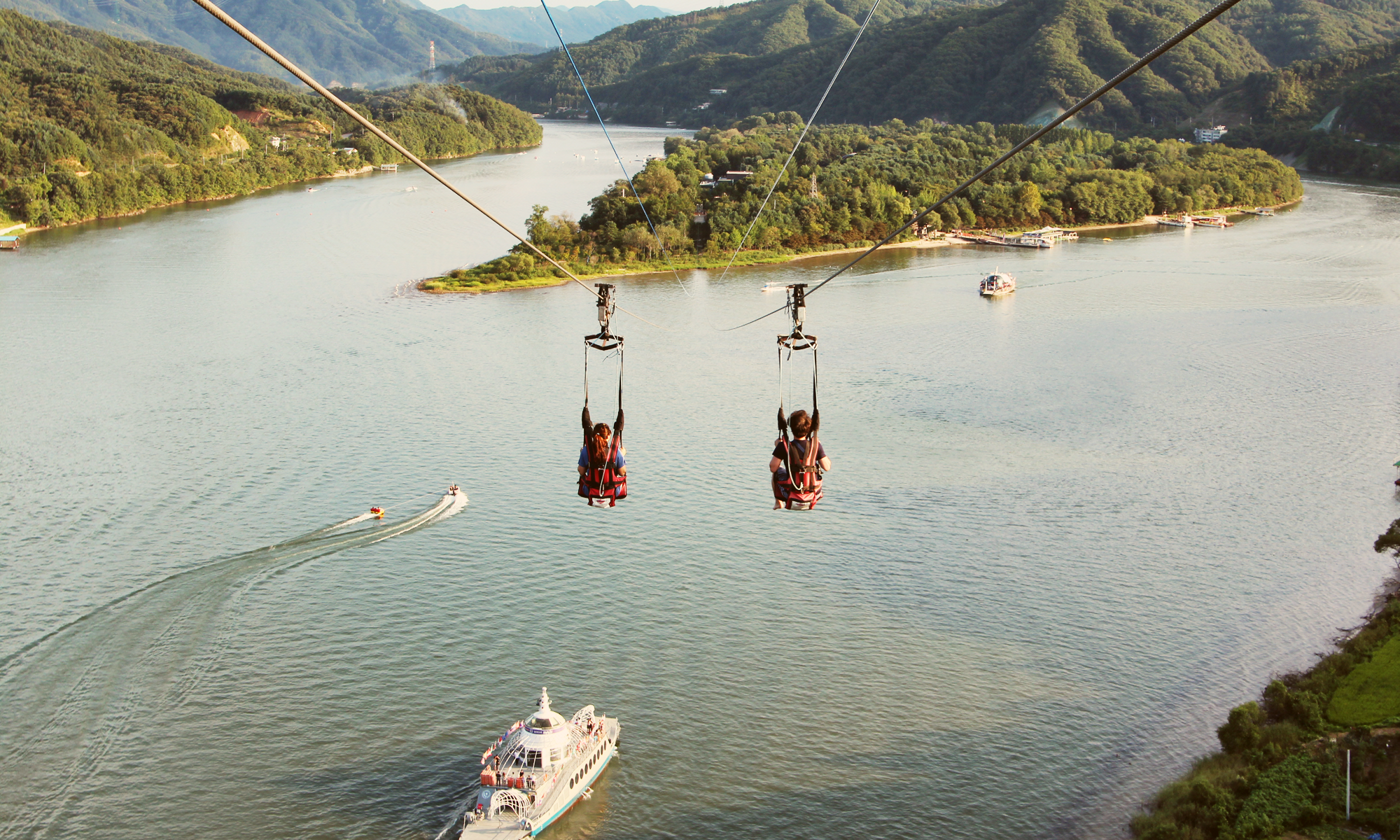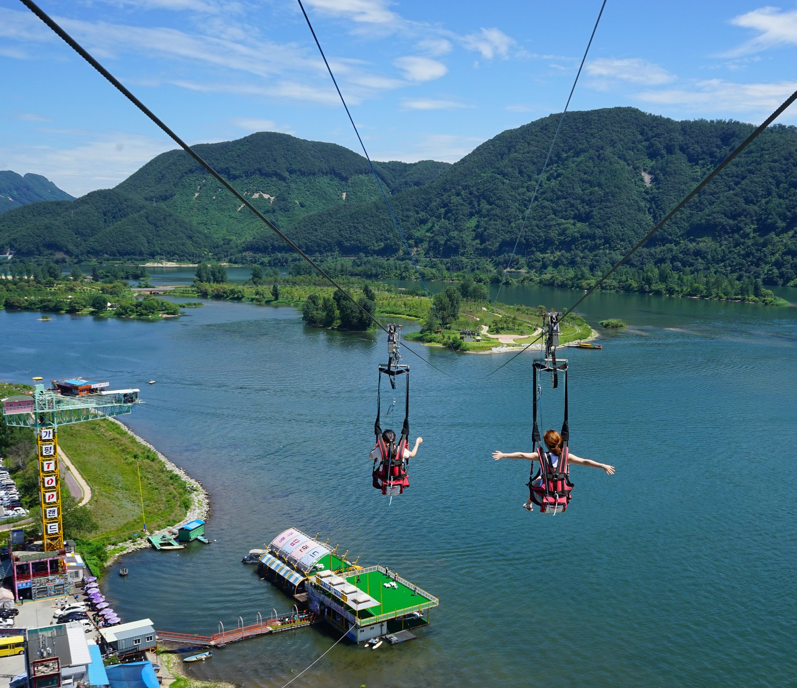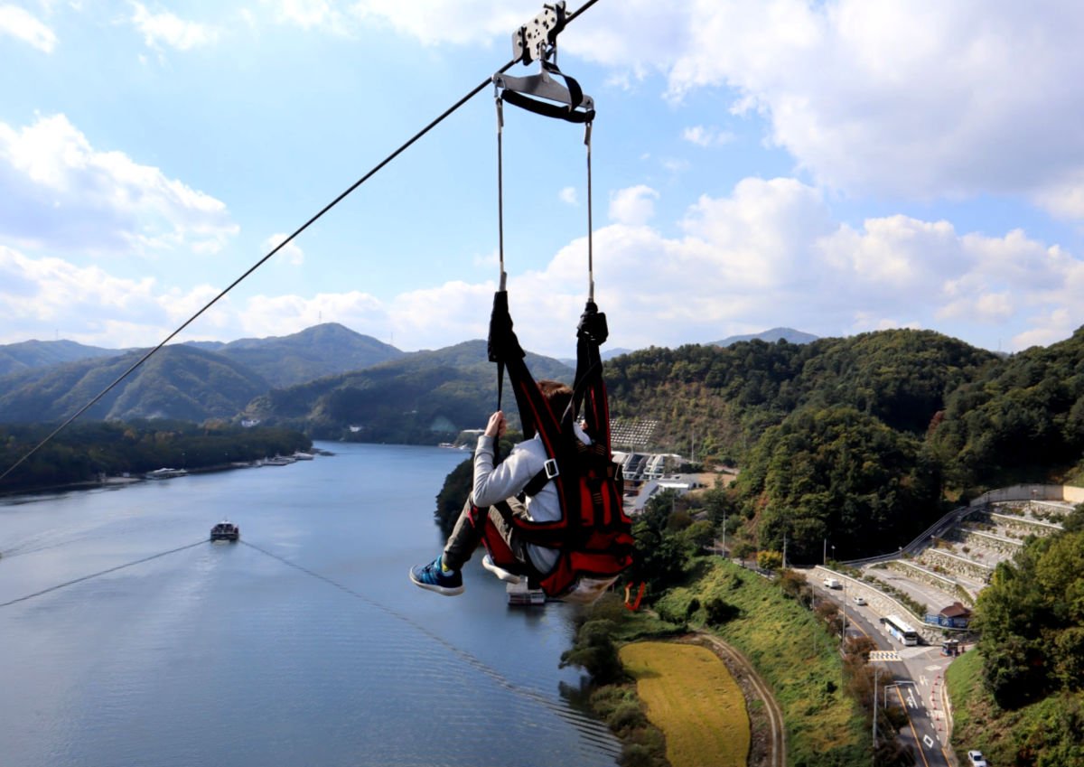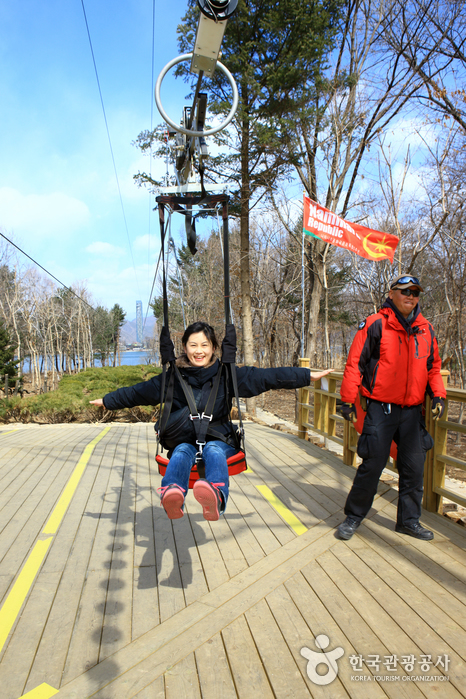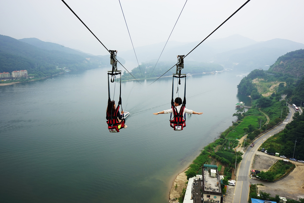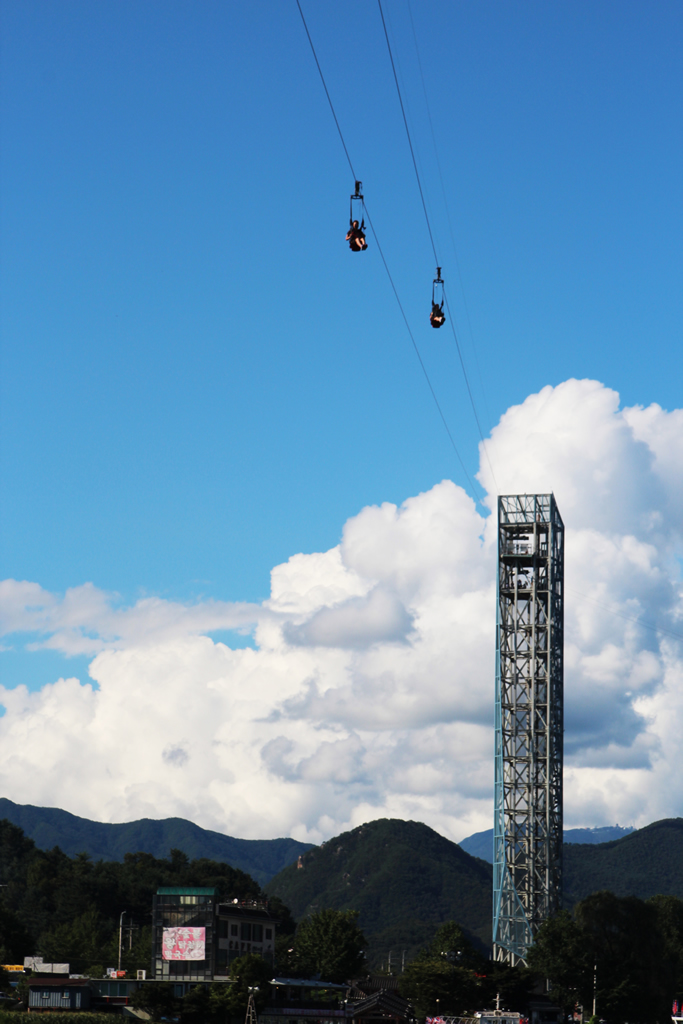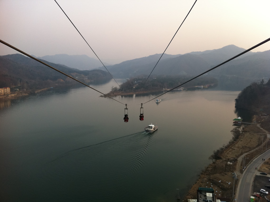 Once you arrive in Chuncheon, make your way to the river-front and look for the ZipWire tower. It won’t be difficult to find as it is the tallest structure in the area. Book your tickets in advance to avoid a long wait for the popular ride. After ascending to the top deck of the 80 meter tower, step out of the elevator and take in the panoramic view of the Han River and the surrounding countryside.