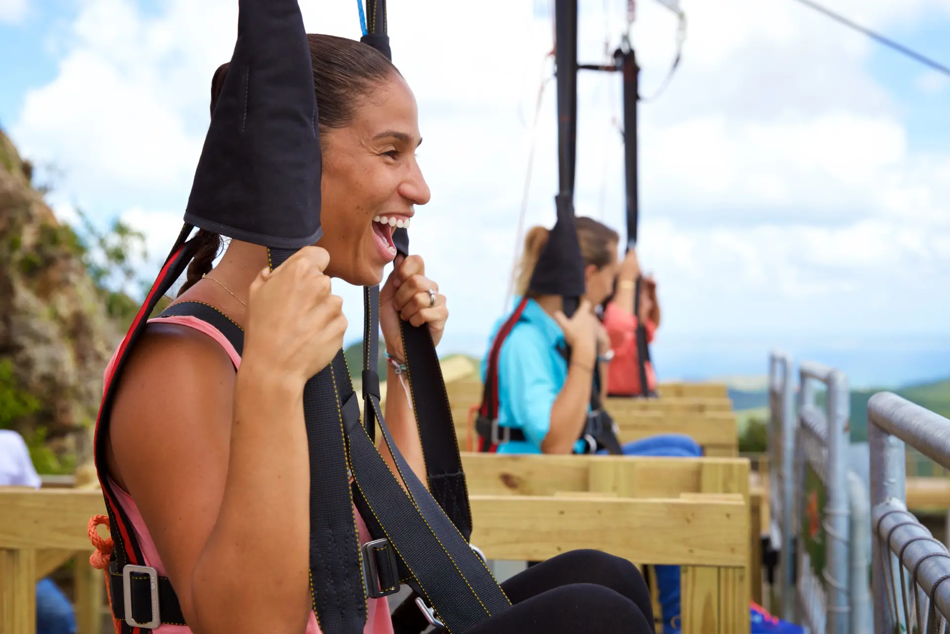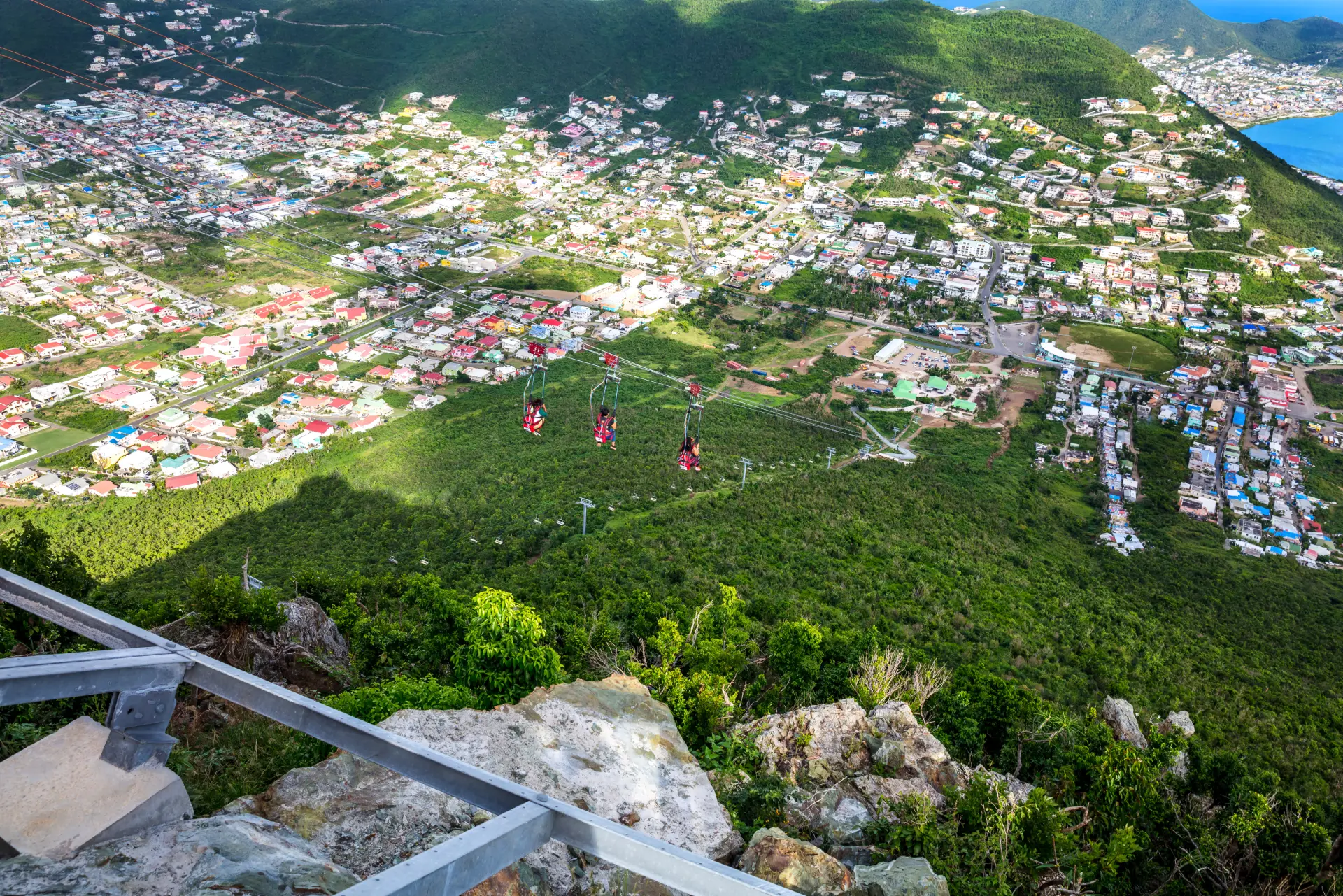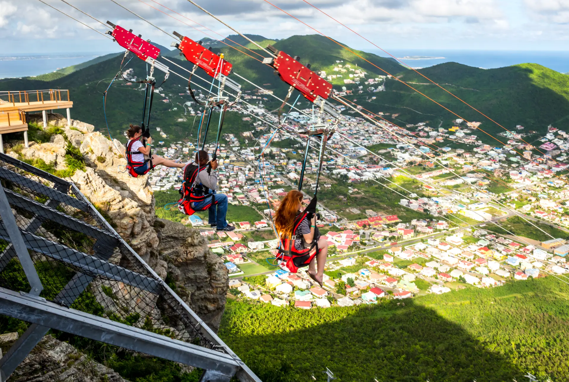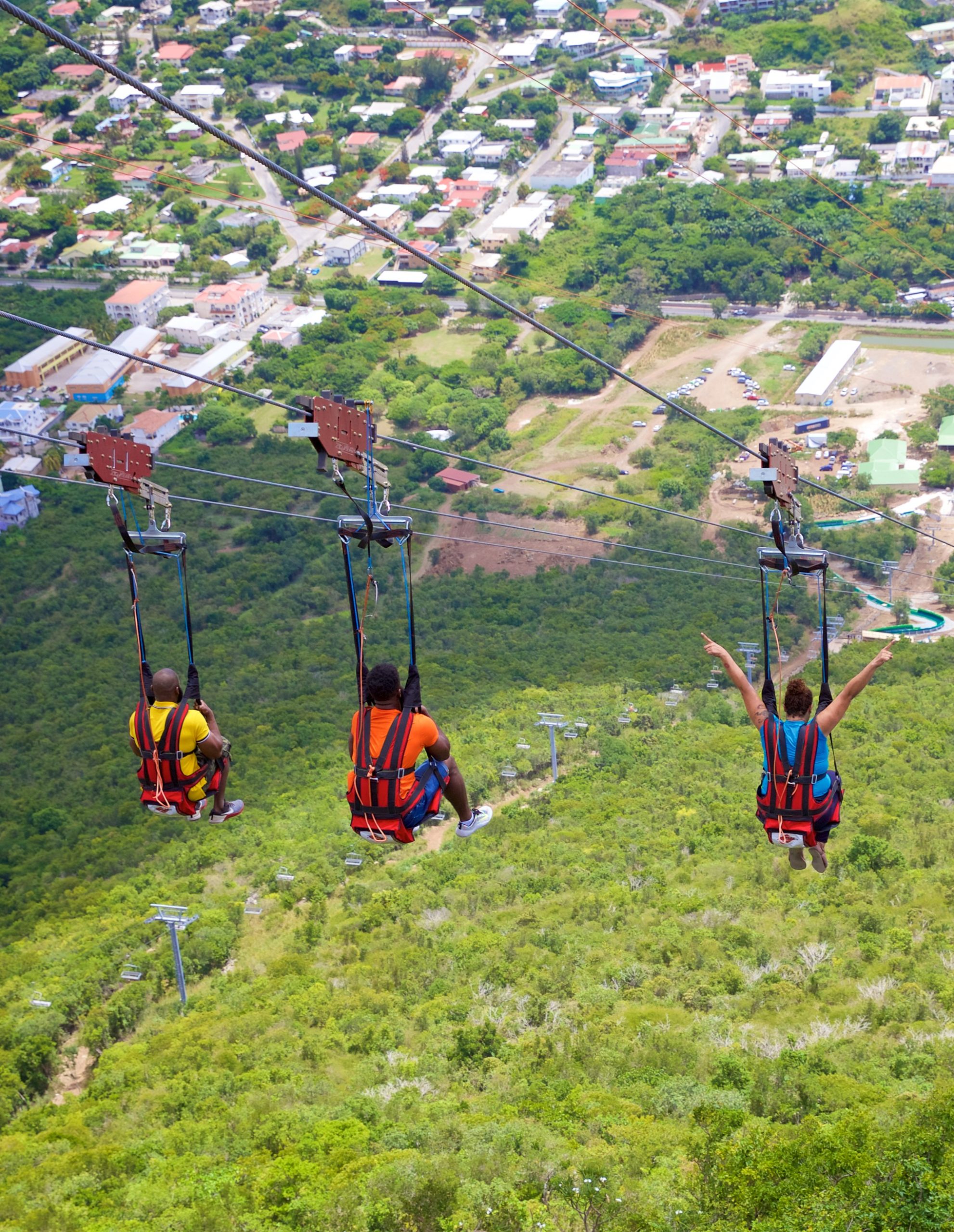 The adventure begins with a scenic ascent on the Soualiga Sky Explorer, a chairlift that carries guests to one of the highest points on the island. From the summit, riders launch from a dramatic open‑air platform and soar high above the treetops, reaching speeds over 55 mph as they descend toward the valley floor. With four parallel cables, groups can ride together and share the thrill of one of the Caribbean’s most iconic adventure experiences.
