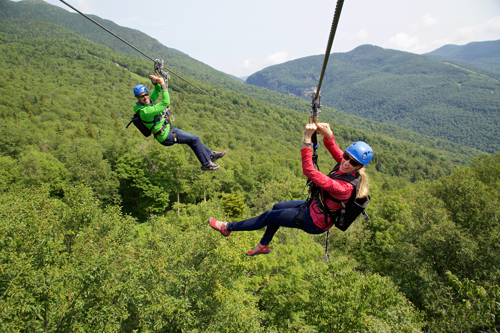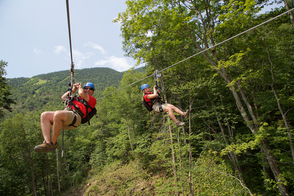 The second span of the Stowe ZipTour®, the Haselton Zip, looks directly across at the famous Smuggler’s Notch, which is a narrow pass through the Green Mountains. This span is all trees and sky, until you look to your right and see the resort base area far below.