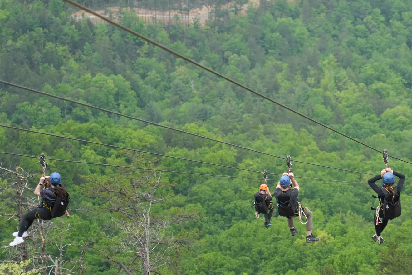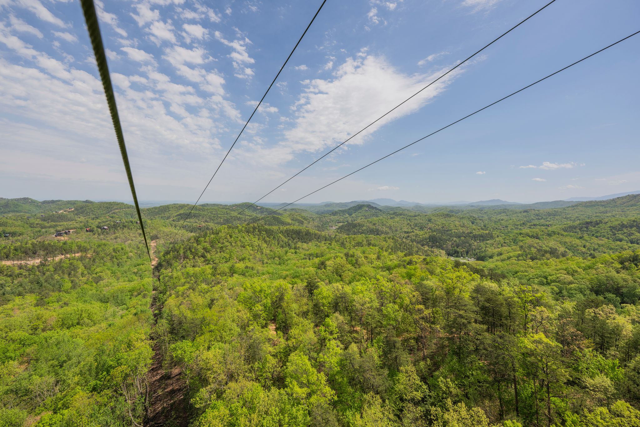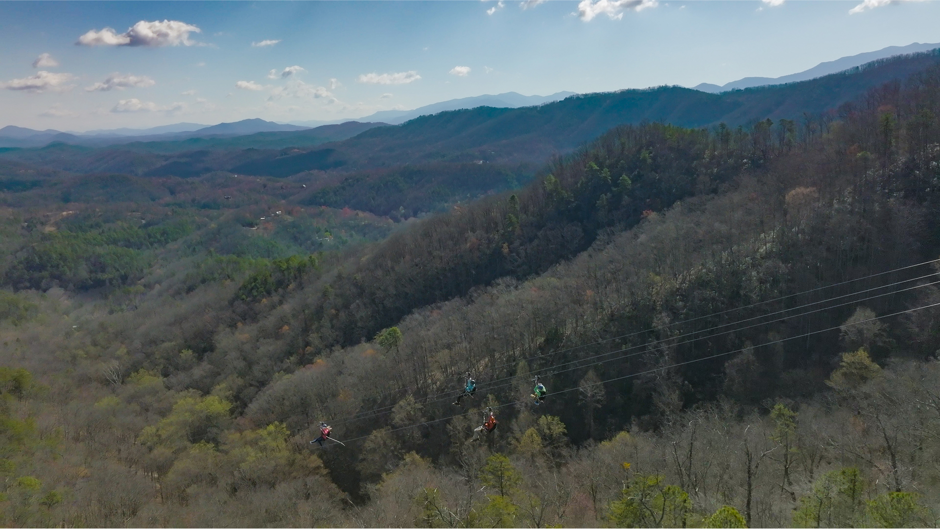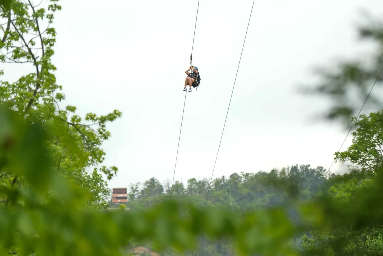 From the summit platform, the MegaZip opens with one of the most expansive panoramas in the region. On clear days, riders can spot Pigeon Forge, the ridgeline of the Great Smoky Mountains, the shimmering waters of Douglas Lake, and even Mount LeConte—a rare four‑landmark view from a single vantage point. Very few ziplines in the country offer a sightline this wide.
